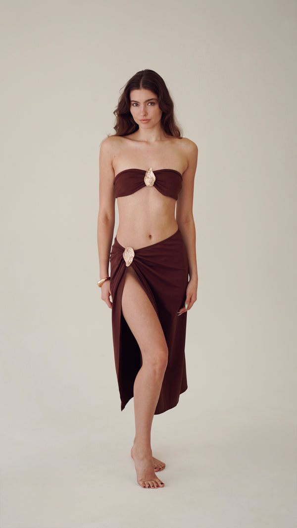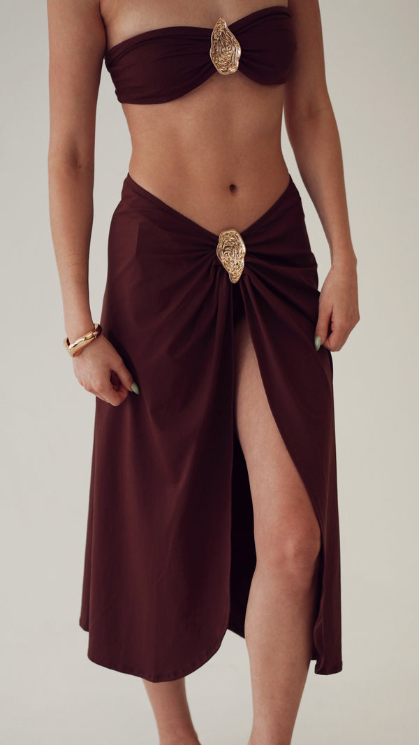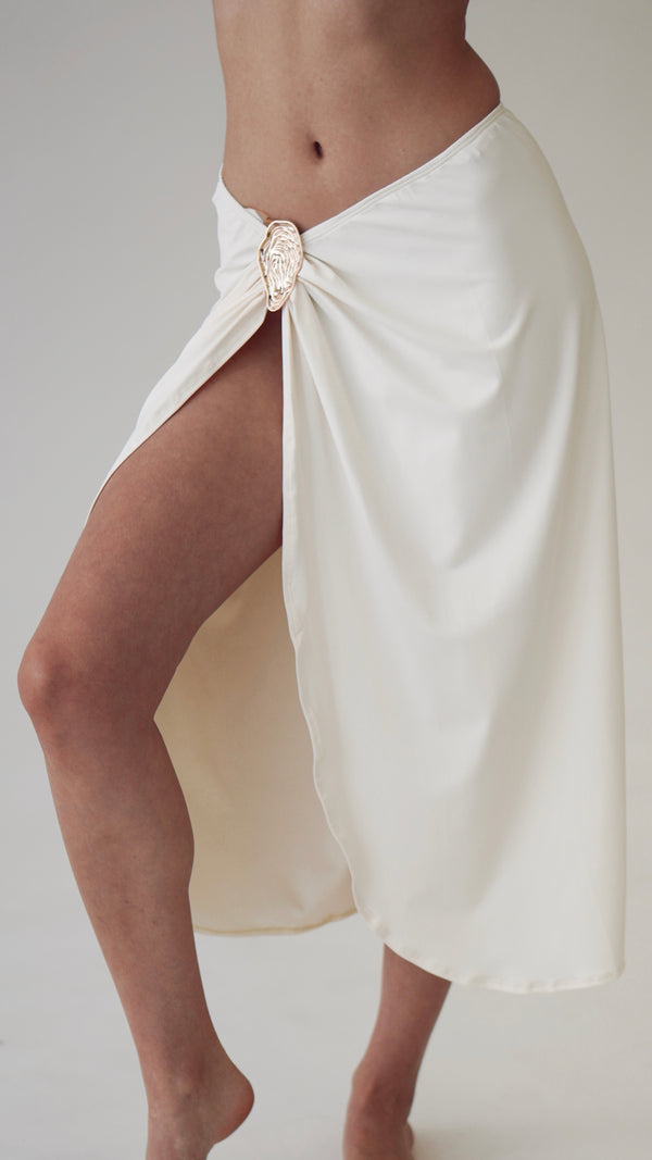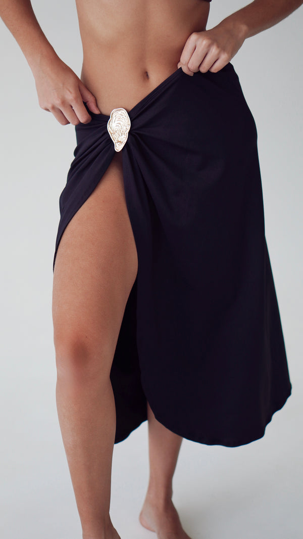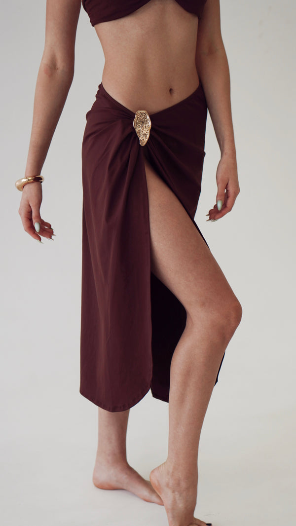 The Maré Skirt redefines relaxed luxury. This sarong-inspired wrap drapes fluidly across the body, fastened by Amaiah’s signature gold seashell detail for an elevated finish. Crafted from lightweight stretch fabric, it offers movement, elegance, and versatility — designed to pair perfectly with The Maré Bikini or worn alone for effortless resort style.